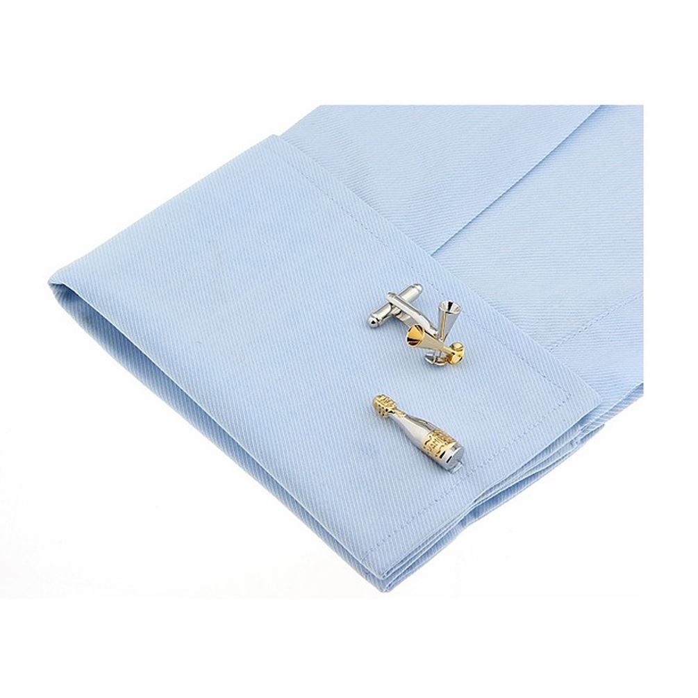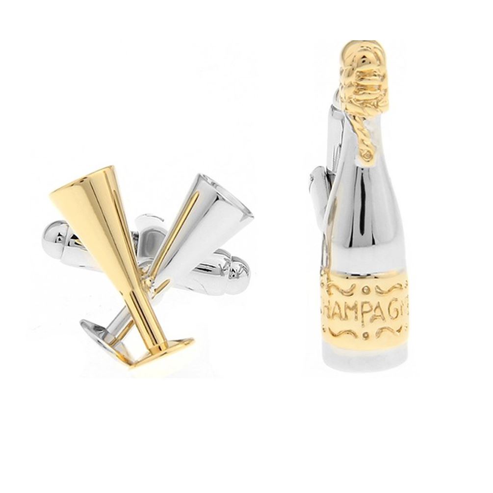 Get something different with our unique luxury champagne cufflinks. A two tone pair of cufflinks with an image of a champagne bottle on one cufflink and on the other two drinks glasses - on in gold tone and the other in silver tone. These cufflinks have a look that's sure to catch the eye. The cufflinks are lightweight and are comfortable on the cuff. Comes with our free velvet gift pouch.