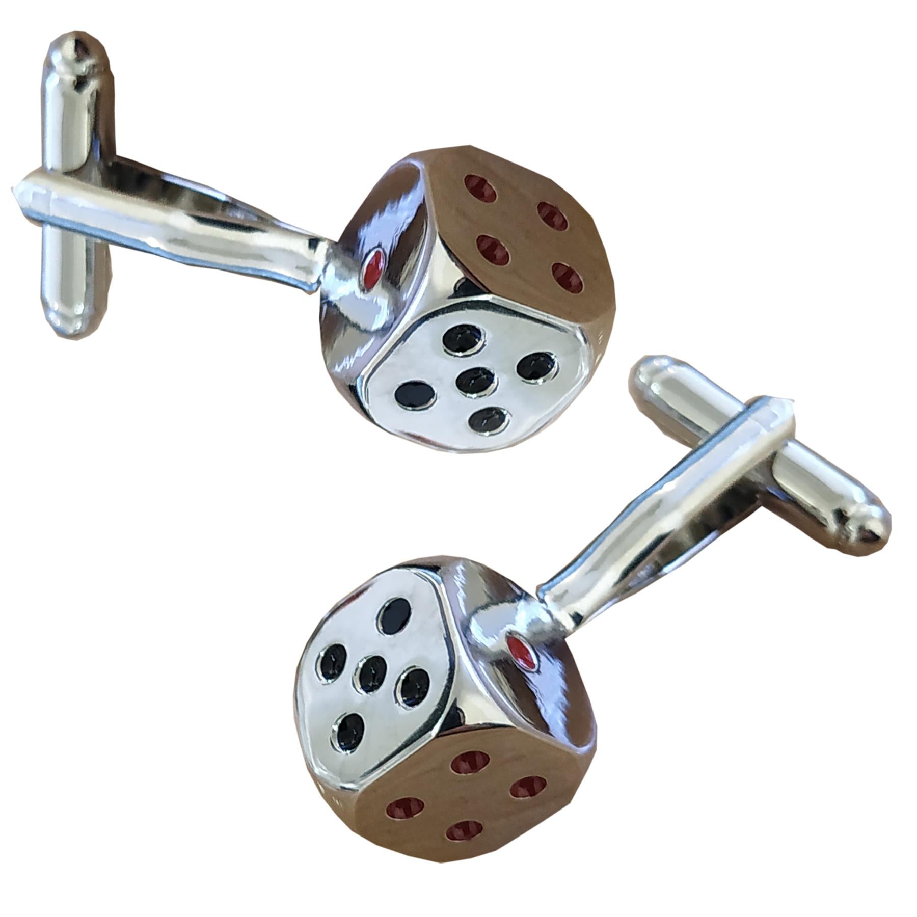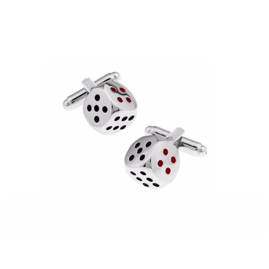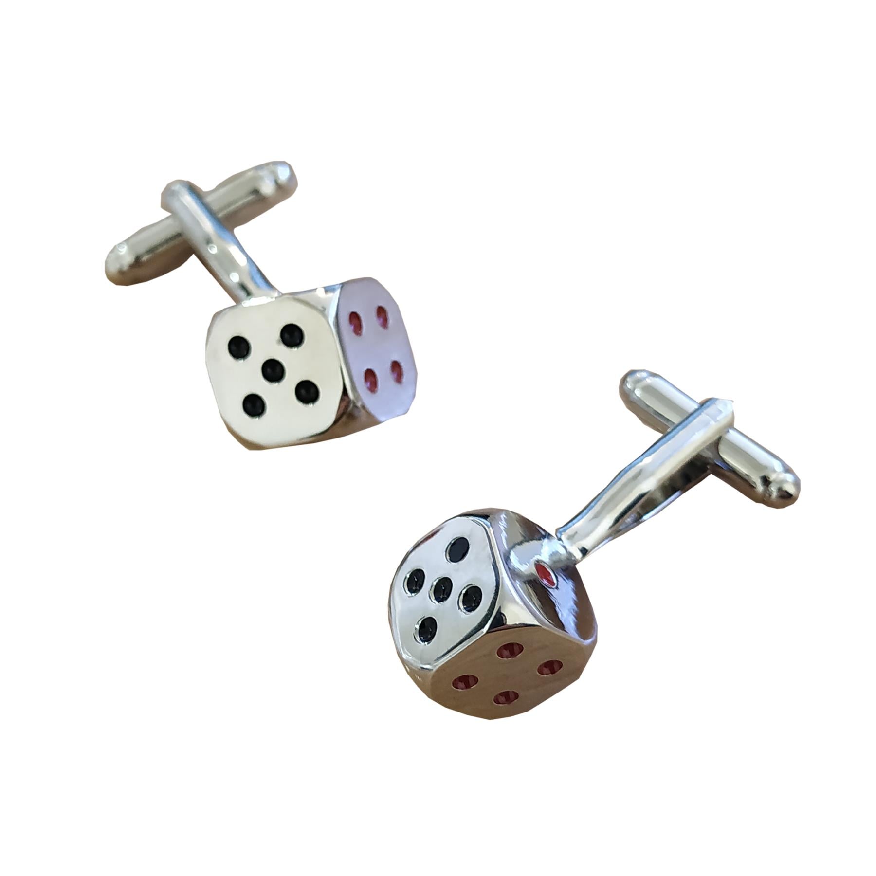 These quality cufflinks are a delightful silver tone dice with the spots in black and red colour.