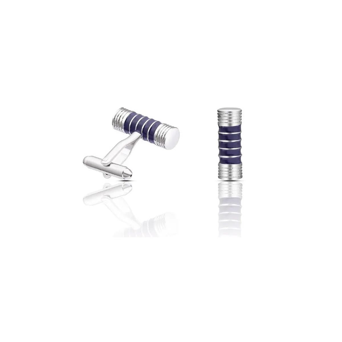 Silver Barrel Cufflinks 5 Blue Stripes Ribbed Design Elegant Formal Fashion UK